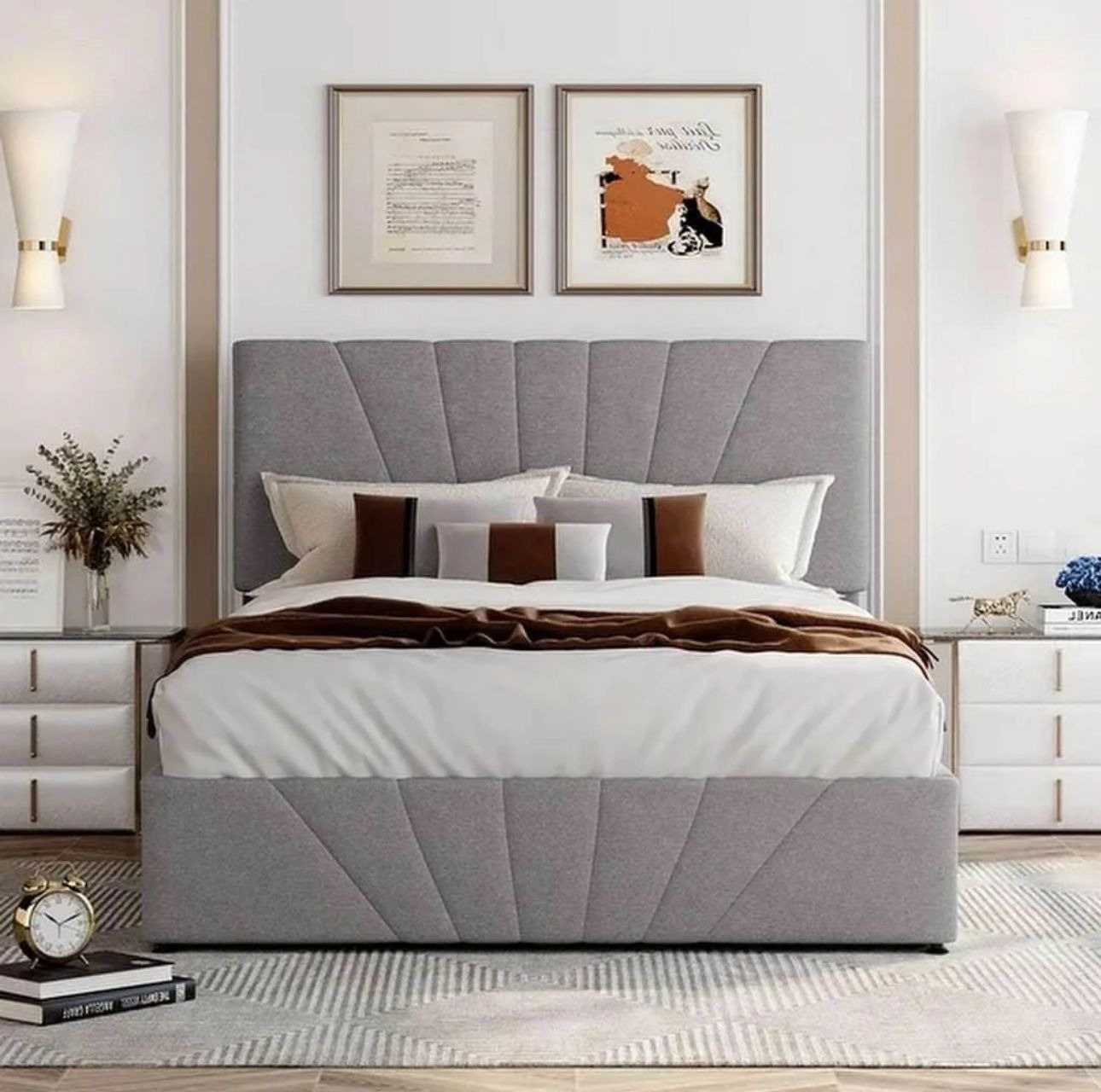 - سرير نوم كبير مزين بقماش الكتان.